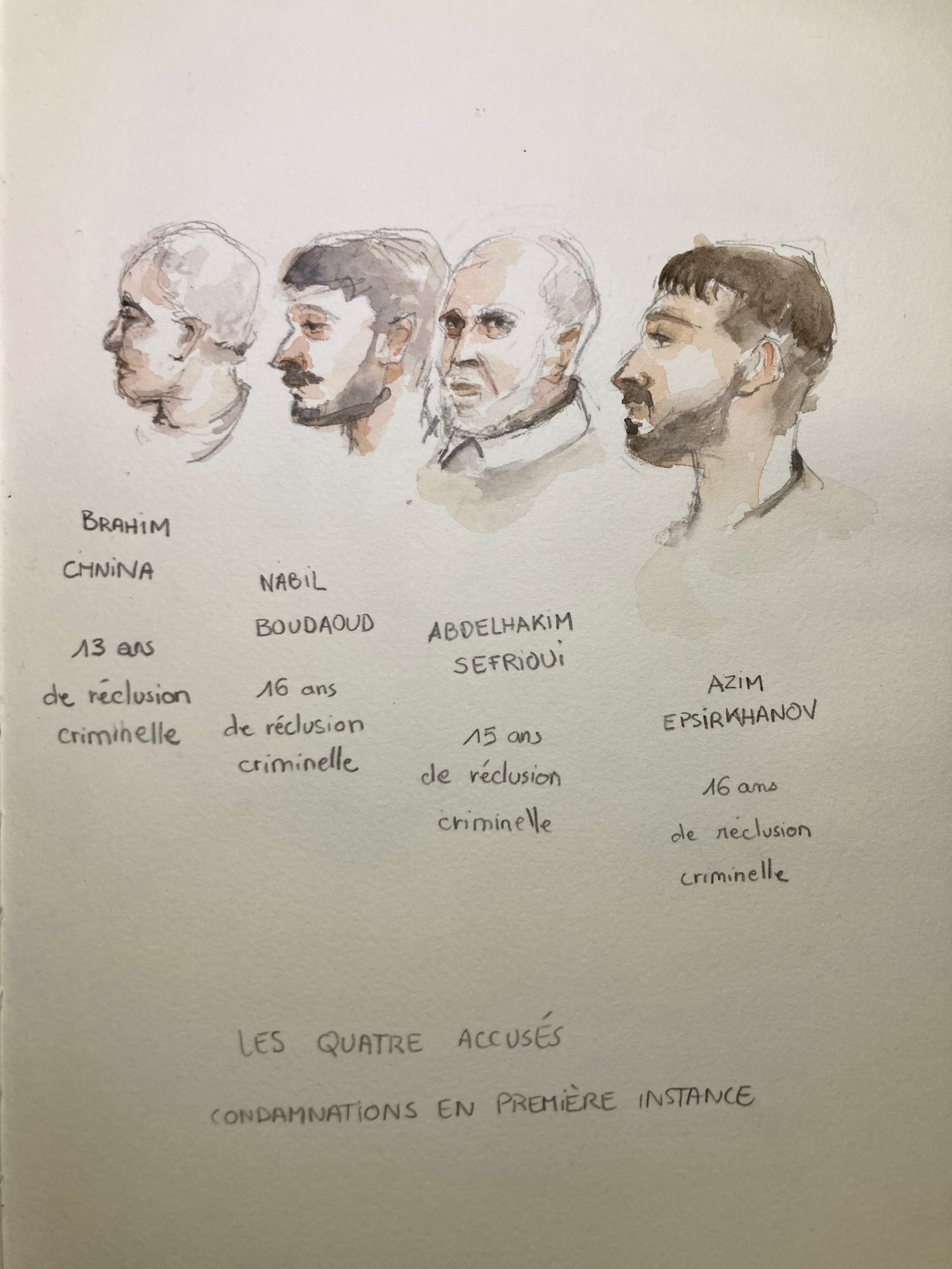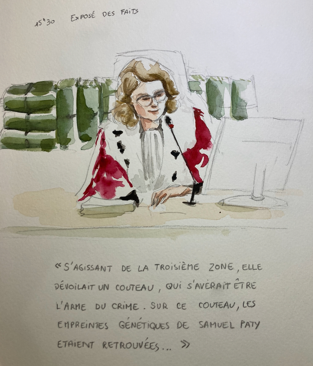 View full thread[Point aquarelle] Puisqu'il y avait plus de médias aujourd'hui, c'est l'occasion de parler de mes 2 camarades dessinateurs qui suivent ce procès depuis le début : le talentueux Matthieu Fayette (à l'encre, principalement monochrome) et le trait vif de Guillaume Brunero, + proche de la caricature.